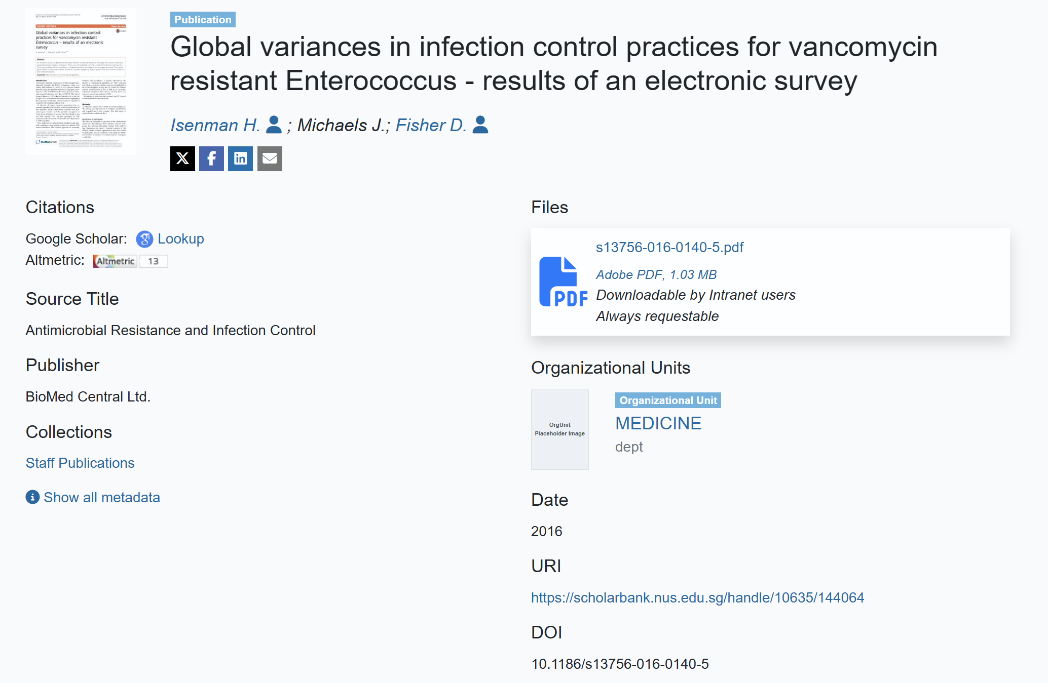 Data repositories or institutional repositories can also be a source of altmetrics. For example, ScholarBank@NUS, our university's institutional repository collects, preserves and showcases the research output of NUS researchers and to increase the research visibility of our reseasrchers' works. Publications deposited in ScholarBank@NUS allows researchers to get altmetric information from Altmetric.com, page views, or number of downloads.